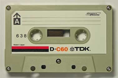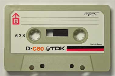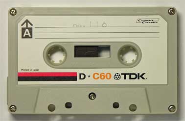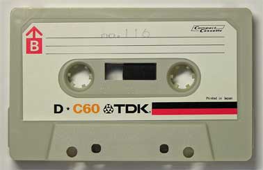 ラベルの上端に再録音防止爪の説明がある。 これにより、サイド表示「A」の上の矢印は単なるデザインではなく、その面の防止爪の位置を示していることが分かる。 |