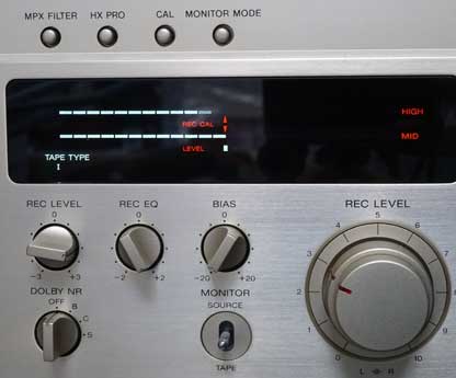 うむむ。見事である。 いずれも、調整ボリュームを回しきる必要はなく、余裕で合わせられた。 当然、レベル変動はそれなりにあるが、許容値と見て良い程度である。 およそ半世紀前の老練なテープ(笑)を軽く手懐けるとは、さすがにドラゴンである。 キャリブレーションが済んだところで、実際の検証作業に移った。 スイープ信号が複数回記録されたCDを音源として、それを各デッキで録音する。 当然ドルビーはOFFにし、録音レベルは「-30dB」に設定した。 |