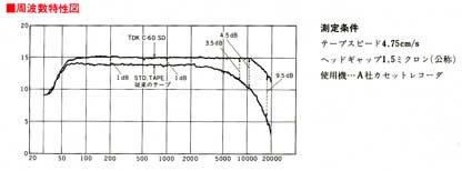 「初代SD」の実力は驚くべきものであった。 これで、当時のパンフレットの表現が決して誇張ではないことが検証された。 勿論、テープの性能を測る物差しは周波数特性だけではないが、カセットの大きな弱点の一つを大巾に改善した製品であったことは確かである。 このSDの登場によって、カセットが本格的なHi-Fi録音用メディアとして認識され、その後の各メーカーの開発競争につながったことでカセットの音が飛躍的に改善されていったのは周知のとおりである。 |