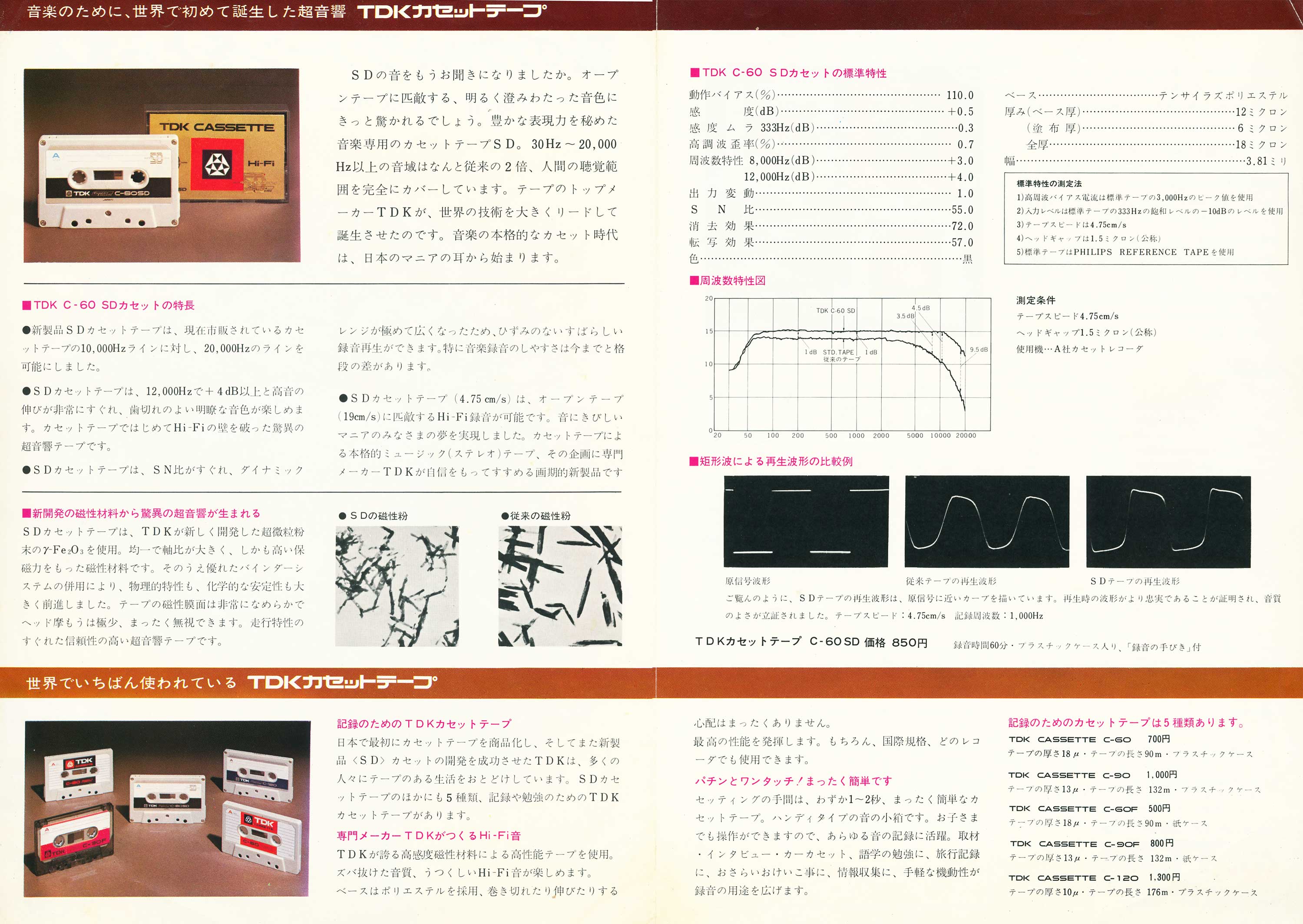 初回からいきなりマニアックなタイトルで恐縮であるが、当博物館の学芸部はこんなものであるのでご容赦いただきたい(笑)。 TDKの「初代SD」はこちらでも紹介しているとおり、カセット初の音楽専用テープとされているもので、LHタイプの先駆けとなった製品である。 「SD」は、磁性粉を微細、均一化することによって物理特性を向上させ、また、バインダーも改良して化学的な安定性やテープ表面の平滑性を高めるなど、カセットテープの性能を飛躍的に向上させた製品であった。 当時のパンフレットによると、 「現在市販されているカセットの10,000Hzラインに対し、20,000Hzラインを可能にしました。」 「12,000Hzで+4dB以上と高音の伸びが非常にすぐれ、・・・驚異の超高音響テープです。」 「オープンテープに匹敵するHi-Fi録音が可能です。」 などと、何やら凄いことが書いてある(笑)。 |