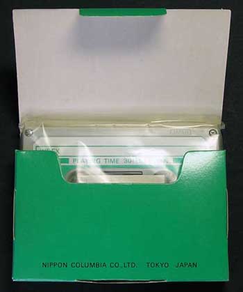 この箱の開け口は長辺方向になっており、上下両方にフタが付いている。 この方がカセットを取り出しやすいが、紙の接着部分が短辺方向だけになるので、箱としての強度や耐久性に難があるのではないかと思われる(笑)。 続いて、ちょっと変わったタイプを紹介する。 |