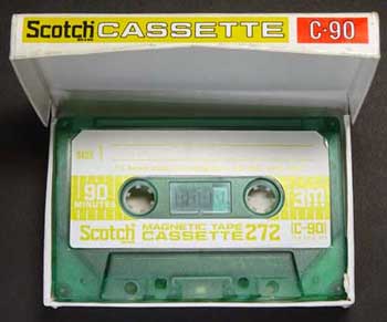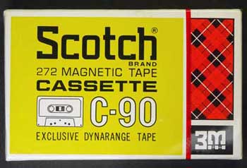 長辺の一辺がヒンジになっており、正面というか上面の大きなフタが片開きでガバッと開く。 これぞ紙箱!という感じで、出し入れは大変容易である。 箱自体は厚手のボール紙でつくられており、頑丈である。 ただ、フタの部分に留めがなく、フタと箱との摩擦によって閉じた状態をキープしているだけなので、うっかり逆さにしたりすると中身が飛び出してしまう可能性がある。 実はこの形式は、カセット以前のオープンリールテープの紙箱と同じで、オープンリールテープを手がけてきた3Mとしては、ごく自然な発想の紙箱だったのだろう。 そしてその後、Scotchは1977年に、何とプロ用に使われる10号オープンリールテープの紙箱と同じ大きさ・形のケースでカセットを販売している。 それがこれ(↓)。名付けて「PRO-PACK(プロパック)」 |