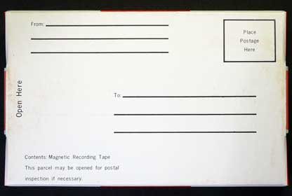 実は、このパッケージ、裏面を見ると分かるように郵送用の封筒になっている。 録音済みのカセットをこの箱に入れ、住所を記入し切手を貼ってポストに投函すればOKである。 郵送中、不用意にフタが開かないようにダブルのタブでロックをかけている形になっている。 フタの部分にテープでも貼れば必要のない機構だが、概して大ざっぱなアメリカ人向けに(失礼)、フタを閉めるだけで簡単に発送できるこのような工夫をしたのではないだろうか(笑)。 館長なら、さらにこの上からセロテープを貼りたいところである(笑)。 |