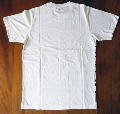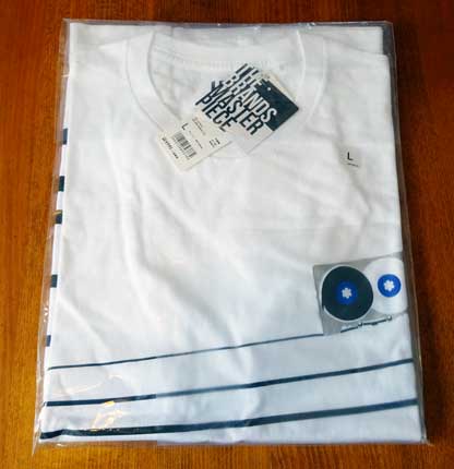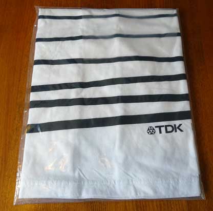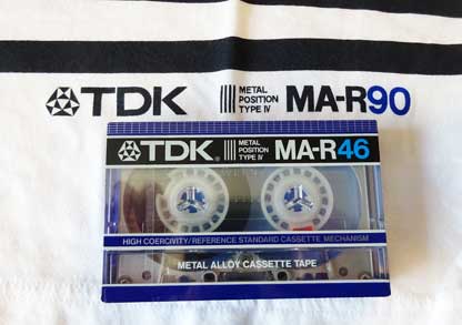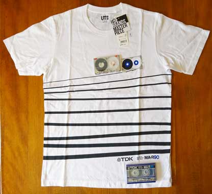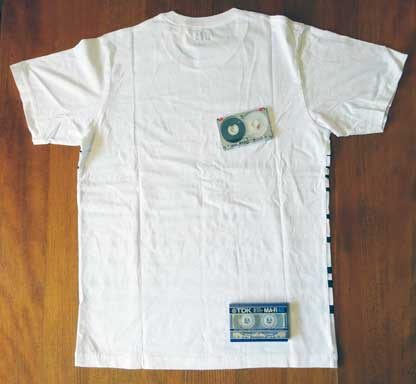 シャツの中央部分の横線はカセット本体から引き出されたテープを表しているようだが、実際のテープがこんなことになったら悲惨だ。 特に「MA−R」のような高価なテープがデッキの中で絡まった挙げ句に、こんな状態で出てきたら泣いてしまうかも(笑)。 シャツの裏側が真っ白で寂しいので、本物を置いてみた。 |