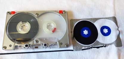 本物と比較すると、かなり細部にこだわってデザインしていることが分る。 特にテープガイド部分のギザギザや2つの位置決め用ホールはかなりリアルに再現している。 さらに、ダイキャストフレームの質感を出そうとしたようで、カセット本体部分のプリントは単なるグレーではなく、銀色のラメになっている。 |