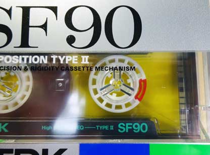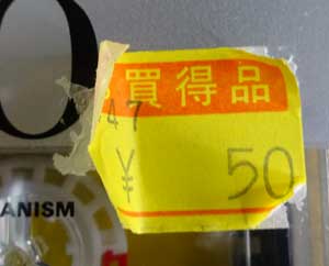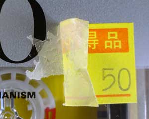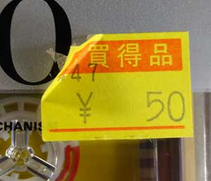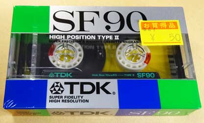 さて、それでは実技に入ることにする。 今回は、この「TDK SF」の右上に貼られている黄色い値札シールを剥がしてみることにしよう。 カセット末期の長期在庫投げ売り時のものか、「50円」という屈辱的な価格の値札である(笑)。 |