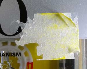 シール部分を拭く際には力を入れてゴシゴシ拭くのではなく、シールの紙の部分に水分を与えるように軽く押さえながら拭く。 この時、シールの接着剤の部分を暖めて柔らかくするため、冷たい水ではなく熱めの温水を使うとよい。 拭き終わったら、シールの角の部分を爪で少し持ち上げてみる。 接着剤が柔らかければ少し持ち上がると思うが、接着剤が古くて固化している場合は難しい。 |