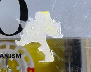 シールの隅が持ち上がり、接着剤の固化も見られないようであれば、シール全体を剥がすことができる可能性が高いので、持ち上がった隅の部分を上に引っ張りながら、ゆっくりと剥がせるところまで剥がしてみる。 運が良ければ、これでかなりの部分をきれいに剥がすことができるが、シュリンクに負担が掛かる作業なので、決して無理をしてはいけない。 剥がしている途中でシールが切れてしまったら、深追いせずに別の隅の方からあらためて試してみる。 きれいに剥がす必要はない。シールの紙の部分が少しでも剥がせれば良しとする。 とにかく、シュリンクを痛めない範囲で、できるだけ取り除くことができればよい。 |