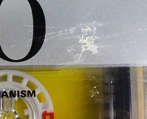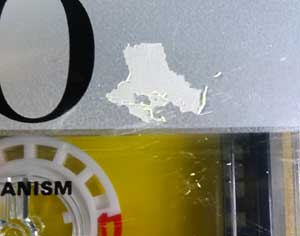 1980年代以降のカセットになるとシュリンクの素材ががプラスチックのフィルムに変わり、強度そのものは高くなるのだが、製造から長期間経っていることには変わりなく、保存状況によってはシュリンクが劣化していたり、小さな穴が開くなどの破損が見られたりする。 特にシール周辺が傷んでいると、剥がす作業によって破れたり傷が広がるなどの致命的なダメージを与えかねないので、この場合も作業に入る前にリスクを検討する必要がある。 とにかく、未開封カセットの価値を上げようしたシール剥がしでダメージを与え、かえって価値を下げてしまうなどというのは本末転倒なので、絶対に避けなければならない。 仮に、作業を開始した後であっても、途中でダメージを与えそうな恐れが出てきたら、その時点で潔く作業を諦め撤退する、という勇気も必要である。 もっとも、その場合は、シュリンクにダメージは無くても剥がしかけのシールが残るため、見た目が悪く「最初から何もしない方がよかった・・・」と悔やむことになりかねない。 やはり、作業前のリスク検討が重要である。 |