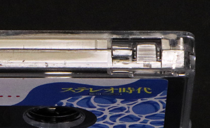 カセットハーフの背の部分にはTypeUテープ識別用のホールが空けてある。 ハイポジテープが市販されていない現在、この穴を開けるだけでも特注になってしまい、製造コストを押し上げることになったようだ。 |