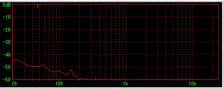 (グラフの縦軸目盛が実際より-10〜-20dB程度下がっていますが、これはパソコンへの最大入力が0dBを超えないように入力を絞っているためです。以下同様です。)