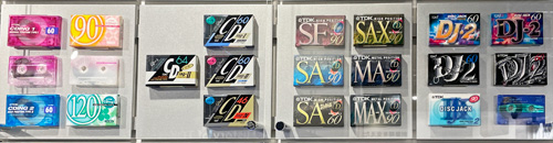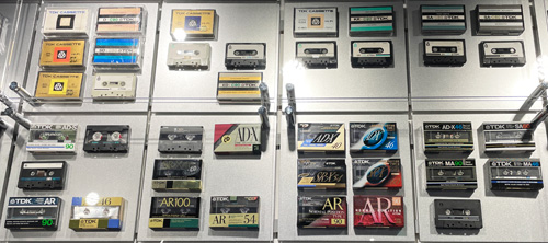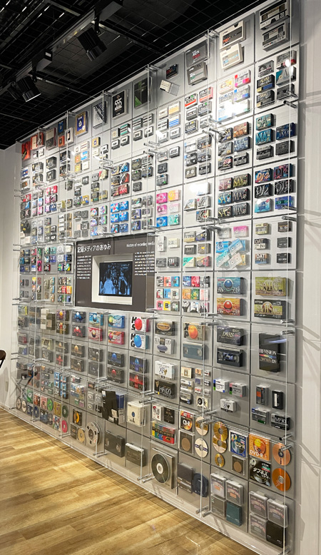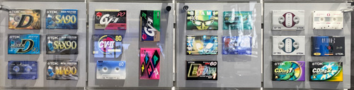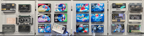 順路では、最初が「歴史ゾーン」となっている。 早速、カセットテープの展示コーナーへ突進(笑)。 カセットだけではなく「記録メディアのあゆみ」という括りでの展示になっている。 |