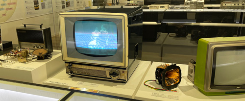 ↑ TDKのアイデンティティーとも言える「フェライト」は古くから家電の部品に使われている。ブラウン管時代のテレビではヨークコイルのコアやフライバックトランスという必須部品に使われていた。 ここに展示されている白黒テレビもOBの努力による実働品。力道山のプロレス映像を流すという演出がニクい(笑)。 |