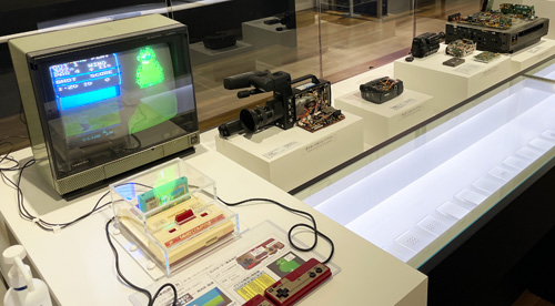 ↑ こちらは機器の小型化に貢献した積層チップ部品の紹介。 小型化され片手で持てるようになったビデオカメラなどの展示。 写真左手前にある初代ファミコンにも使われていたらしい。このファミコンも動作品なので実際に遊ぶことができる。 |