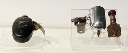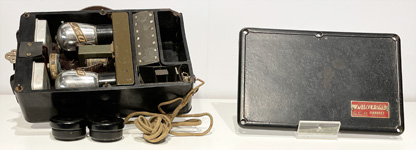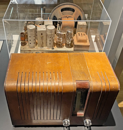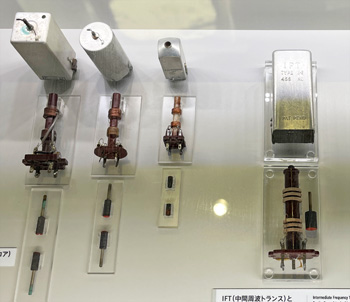 ↑ 写真上は、戦後間もなくのスーパーヘテロダイン方式のラジオ。 GHQの命令で、性能の劣る従来のストレート方式のラジオが禁止され、この方式のラジオが量産された。 スーパーヘテロダイン方式のラジオに必要な部品である中間周波トランス(IFT=写真下)にはフェライトコアが不可欠で、TDKがその唯一の供給元だった(!)ため、TDK飛躍の礎となったらしい。 このラジオではないが、実働する真空管式ラジオの展示もあった。 |