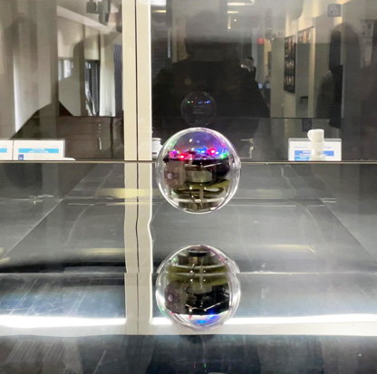 ↑写真では分かりにくいが強力な磁力で浮いている球。何だかSFみたいで不思議。