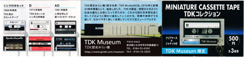TDKのカセットテープのミニチュアがカプセルに入っているガチャガチャである。 入っているのは「TDK 歴史みらい館」限定品の「Synchro Cassette」「D」「AD」の3種類のうちいずれか1つで、1回500円となっている。 館長は5回やってみた。・・・・・その結果は後ほど(笑)。 |