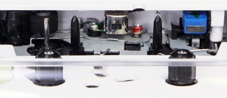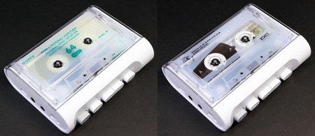 上の画像の中央にある録再用ヘッドは小さめである。また、右にある青色の消去ヘッドはマグネット式。つまり、単なる磁石なので電線はつながっていない。 この機械、録音もできるのだが、交流バイアスではなくDCバイアス方式なので、録音の音質やSN比については多分・・・(ry 購入したモデルはフタが全面透明なので、中のカセットがシースルーである。そこで、試しにいろいろなカセットを入れてみた(笑)。 |