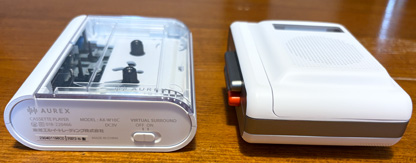 外装は全てプラスチック製で、エッジに丸みを持たせた形状になっている。 ホワイトタイプといっても全体が真っ白ではなく、上下側面はダークグレーのカラーリングになっていてかっこいい。 大きさ的には、Aurexとほぼ同じだが、表・裏にスピーカーやクリップが付いている分、厚みが1センチほど大きくなっている。 全体の丸みの持たせ方がAUREXとは異なり、手になじみやすい形状になっており、滑り止め加工や適度に凹凸があることで片手での取り回しがしやすく、AUREXよりコンパクトな感じがする。。 操作ボタンを上にして立てて使えるというのも使い勝手の良いポイントだ。 また、カセットホルダーを上側に置いて使う場合、下側にクリップがあるのでガタガタと不安定になるかと思ったが、意外と安定している。 使い方を想定したクリップの形状や荷重バランスが考えられているようだ。 |