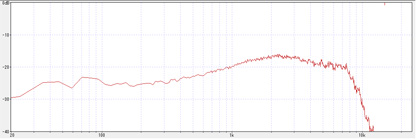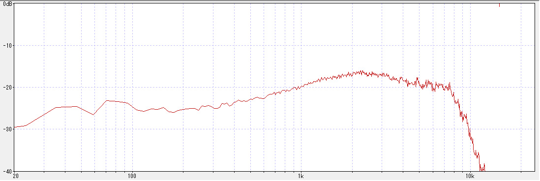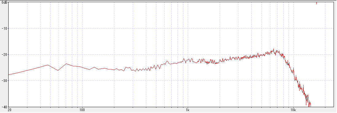 それでは、いよいよ試聴に移ることにしよう。 この製品はリチウムイオン電池内蔵の充電式である。 充電は、手持ちのスマホの充電器かパソコンに付属のUSBケーブルをつなげて行う。 Bluetoothに対応しておりワイヤレスイヤホンも使えるが、残念ながら館長は持っていないので、試聴は有線のヘッドホン及び内蔵スピーカーで行うことにした。 まずは、ヘッドホンをつなぎ、他のデッキで録音したテープをセットして、再生ボタンを押す。 ・・・・・ うむ。なかなか良い。 ナローレンジ気味ではあるが、まとまりは良く、パンチのある元気な音である。 次に、内蔵のスピーカーで聴いてみる。 ・・・・・ これは、まあ、見た目どおりだった(笑)。 昔懐かしい、小型のラジオを彷彿とさせる音である。 音質はともかくとして、スピーカーが内蔵されていると、カセットの内容確認、会議録音の再生、複数人で聴く場合などに大変便利で重宝する。 さて、実際の音は分かったが、数字的にはどうなのか。 本製品は周波数特性やワウフラッターなどの特性は公表されていないので、実際のところを当館のレビューのお約束として実測をしてみることにした。 (以下の結果は、あくまで購入した機器の実測であり参考値です。) まずは、周波数特性から。 |