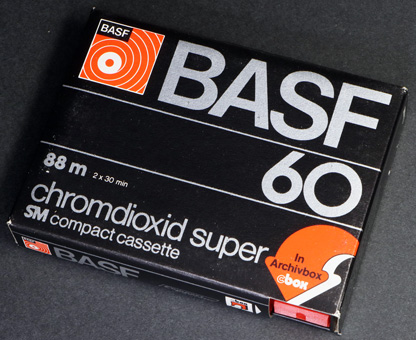 BASFのクロムテープで、同社の本拠地であるドイツ(当時は西ドイツ)をはじめとしたヨーロッパ地域向けの製品である。 磁性体に二酸化クロムを使用した、言わば本物のクロムテープで、当時2モデル販売されていた同社のクロムテープのうちの上位にあたる製品である。 パッケージは三段ストライプタイプのデザインで、同社のクロムテープの製品カラーであるブラックが全面的に使われている。 カセット本体内部にはBASFカセットの特長となっている「Security Mechanism」を搭載している。 展示の製品は、BASF独自の「C-BOX」というプラケース入りのものである。 |