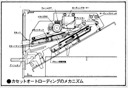 カセットをキャリアに載せた状態でドアを閉めるか又はカセットを少し奥に押すと、ローディング用のモーターのスイッチが入り、その力でキャリアが自動で奥へ移動し、最後にヘッド正面に落とし込まれてカセットをローディングさせるというものである。 落とし込まれる時に、リッド奥の左右にあるレバーがカセットを上から押さえるようになっており、このレバーがカセットをホールドしてがたつきを防ぐ仕組みになっている。 カセットは水平ではなく、奥側が若干高くなるよう斜め30°の角度でセットされ、さらに、リッド内部の上下には照明が付いているので、ローディングされたカセットのラベルやテープの残量確認がしやすくなっている。 |