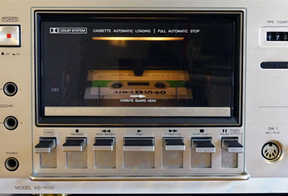 調整を終え、録音を始めるにはポーズボタンを押してポーズを解除する。 録音が開始されるとテープランニングインジケーターの光も左から右に流れ始める。 テープを止めるのはストップボタンであるが、ストップボタンはイジェクトボタンと兼用になっている。 テープが動いている場合はストップボタンとして働き、動いていない場合はイジェクトボタンとして機能するようになっている。 これは、本製品だけではなく、この時代のAIWAのデッキに共通した仕様である。 兼用させると内部の機構がより複雑になると思うのだが、これもボタンの配置やスペースに制約のあるラジカセの設計思想と相通じたものなのかもしれない。 |