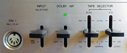 左から「INPUT SELECTOR(入力切換)」「DOLBY NR」「BIAS」「EQ」である。 入力切換はライン又はマイク・DINのいずれかを切り替えるもので、ラインとマイク(DIN)のミキシングはできない。マイク録音する場合は、電源ボタンの下にあるマイクジャックにマイクをつなぐ。 入力切替スイッチの左にあるのは、DIN規格仕様のライン入出力ジャックである。 同じものがバックパネルにもあるが、こちらの方はダビングなどで別のデッキを一時的に接続する場合に便利である。 DIN端子からの入力を使う場合は、入力切替スイッチを下側(MIC/DIN)にする。 バイアスとイコライザのスイッチは、それぞれフェリクロムテープが使える3段切換となっている。 続いて、録音レベル調整をする。そのためには録音スタンバイ状態にする必要がある。 まず、操作レバーの一番右にあるポーズボタンを押し下げる。 次に、録音ボタンと送りボタンを同時に押し下げロックさせる。 これで、録音スタンバイ(ポーズ)状態となる。 この時、カセットリッド内の左にある赤い「REC」ランプが点灯する。 |