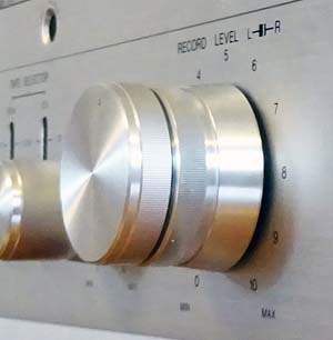 この時代らしく、操作はソフトタッチのボタンではなくピアノキー式のレバーである。 この方式は、レバーのストローク、つまり手動力によって内部の複雑な機構を動かしているため、力を入れて押さないと機能しないものが多い。 しかし、本製品は驚くほど軽い力で動作する。レバーを押し下げて最後にカチッとロックされる直前には引き込まれていくような感じさえするほどである。 この辺は、カセットテレコの経験豊富な同社のノウハウが生きているのだろう。 ところで、写真を見てお気付きかと思うが、操作レバーの下に棒のようなものがある。これは「操作ボタンバー」というものらしい。 SONYのカセットデンスケなど可搬型デッキに取り付けられ、おしゃれな感じもあって一時期ちょっと流行したものだが、据置型でこれが付いているのは珍しい。 可搬型デッキの場合は縦置きや不安定な状態で使う場合も多く、ボタンとバーを2本の指でつまむようにしたほうが力が入れやすく確実に操作ができる。また、屋外使用の際にバーがボタン類をガードするという役割もするのでその存在意義は大きい。 しかし、本製品の場合はどうだろう? 据置型であるし、ボタンは下へ軽く押せばよく、つまんで力を入れる必要はない。操作ボタンをガードする必要性も薄い。 とすると、これは装飾と考えるべきだろうか? さて、録音スタンバイ状態にすると、録音レベルの調整が可能となる。 録音レベルの調整は、レベルメーターを見ながらパネルの右端にある調整ボリュームで行う。 レベルメーターは左右独立したVU型で、目盛りは-20VUから+6VUとなっている。カセットデッキのメーターとしては大型で視認性がよいので、レベル確認がしやすい。 左右メーターの間にはピークレベルインジケーターがある。 インジケーターは3dB(黄・下)と7dB(赤・上)の2ポイントである。 なお、各メーターの下にある穴はメーターアジャスト用である。メーターの0ポイントがずれた場合にドライバーを突っ込んで調整するためのものだが、通常は(と言うか、ほぼデッキが粗大ゴミになるまで1回も)使うことはないので、パネル面の淋しさを補う飾りの要素が大きいのではないかと思う(笑)。 |