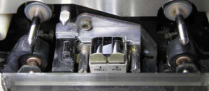 もう一つ、本機の見た目を決定付けているのはカセットテープの装着部分だろう。 カセットの取り付け方法は当時流行した「正立・フルオープン」タイプ(カセットをリッド内にローディングするのではなく、デッキ表面部分に正立させて直接装着するタイプで、使用中のカセットがほぼ全て見える。)であるが、本機の場合は、さらに走行時のテープやヘッドなどの状態まで見えるよう、ヘッドブロックやカセットの保持機構が筐体の外側に出窓のように飛び出ている構造になっている。 そのため、非使用時にヘッドハウジングを保護するためのダストプロテクターが付いている。 |
