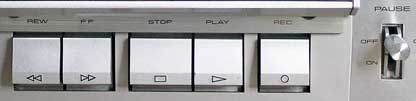 本機のテープ操作はほとんどが平たい押しボタンによるものであるが、ポーズだけはレバー式のスイッチが使われている。 これはよく考えられていて、レバーを上下するだけでポーズ状態/解除となるため大変操作性がよく、素早い操作が可能である。メカの応答も大変俊敏である。 FM放送の録音において、曲紹介〜曲開始の一瞬の間にテープをスタートさせたり、曲の終わりでアナウンサーが息を吸い込む音を聴いた瞬間にポーズでテープを止めるなど、当時のエアチェッカーにとって必須であった操作に大いに助けになったであろう。(笑) |