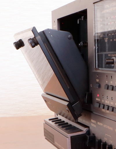 パネルの左側には、これまた大型のカセットリッドとその下には操作ボタンがある。このボタン部分は、後述のように実は着脱式のワイヤレスリモコンになっている。 パネルの中央部には本製品の特徴の一つである「ATRS」システムの操作や表示部分があり、パネルの下の段にはモニター切換やドルビーなどのスイッチ類及び入出力の調整ボリュームが並んでいる。 パネルが大きいせいか、ボリュームのノブも大きめのものが使われており、かなりの存在感がある。 |