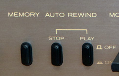 ある程度のグレードのデッキであればほぼ標準で搭載している「メモリーカウンター」という機能があるが、本製品では、これに加えて「オートリワインドストップ」「オートリワインドプレイ」という2つの機能を持っている。 「オートリワインドストップ」というのは、テープの終端を検知すると自動巻戻しが行われてその後停止するもの。 「オートリワインドプレイ」というのは自動巻戻し後に再生を始めるものである。 メモリーカウンターをONにしておくと、カウンターが「999」の位置で自動巻戻しが停止する。 メモリーカウンターとオートリワインドプレイを併用することで「999」とテープ終端の間で再生を繰り返すことができる。 |