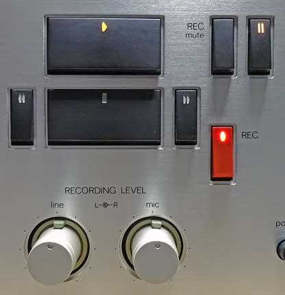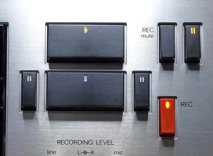 さて、話を戻して、録音操作に入る。 録音レベルを調整するためには、録音ポーズの状態にする必要がある。 そのためには、まずポーズボタンを押す。すると、カチッという音とともにスイッチのポーズマークの部分が点灯する。 次に、赤い録音ボタンと送りボタンを同時に押す。すると今度はガチッと重みのある音とともにヘッドブロックが上がる。もちろんテープは走行しない。 これで、録音ポーズの状態になる。 この方法は、当時のSONYのデッキと同じである。敢えて二度手間にすることで、誤操作の防止を優先させる方法である。 個人的には、他社の録音ボタン一発方式よりこの方が好きである(笑) 送り、録音、ポーズの各ボタンはマークが透過照明で光るようになっており、大変に高級感がある。 |