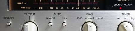 LED表示のメーターは、80年代以降においては普及機でも使われた方式であるが、針式メーターがほとんどであった本製品発売当時においては最先端のものであり、それだけでも斬新で高級感を与えるものであった。 さらに、本製品の場合、目盛やドルビーマークなどは横から別の照明を当てることによって浮き出して見えるようになっており、さらに高級感を高めるデザインとなっている。 よく見ると、このメーターの下の方に「metal range」と書かれた表示がある。 これは、テープセレクタをメタルテープに合わせた場合、メーターの目盛はこちらになりますよ、という意味で、通常(normal/CrO2)テープの場合のメーターの最大目盛は+6dBだが、ダイナミックレンジが大きいメタルテープ使用時には最大表示が+10dBになる。 なお、LEDのセグメント数は変わらないため、メタルの場合、最小目盛が-30dBから-20dBに変わる。まあ、実用的には最大ピークレベルを監視する方が重要なので、これは合理的である。 メーターの下にはスイッチ類がレイアウトされており、回転式と押しボタン式のものが使われている。 |