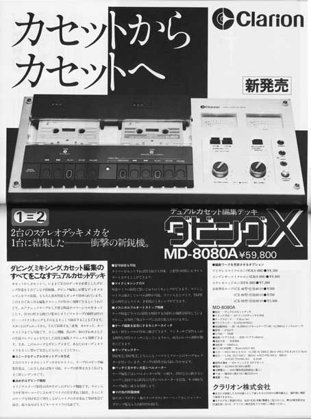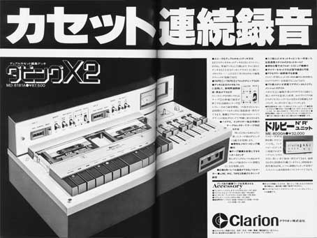 クラリオンは1970年代において既に車載音響機器(当時はカーラジオ、カーステレオが中心)の専門メーカーであったが、車載機器はOEM供給が多いということや、そもそも自家用車が今ほど普及していなかったこともあって、1970年代前半まで、一般的にはクラリオンという社名・ブランドの認知度はあまり高くなかったと思う。 しかし、1975年に初代クラリオンガールに選ばれた「アグネス・ラム」の人気により状況は一変。彼女を宣伝に多用することで、クラリオンの認知度は一気に高まったのであった。 そんな同社が、長年カーステレオ用のカセットプレイヤーを製造してきた技術の蓄積を基に(ちなみに、クラリオンは日本初のカセットカーステレオを発売した会社らしい。)、家庭用据え置き型ハイファイカセットデッキ市場に本格的に参入すべく開発した製品が本機なのである。 同社は、それまでも据置型のコンポーネントステレオやカセットデッキを販売していたものの、品揃えが少なく、今ひとつパッとしなかった。 本格参入にあたり、クラリオンとしてもかなり戦略を考えたのだと思う。 「デッキ2台分の機能を1台分の価格で売ればお得感も大きい」と考えたのかどうかは分からないが、とにかく、このダブルデッキは1976年に発表された当時かなりの話題となった。 |