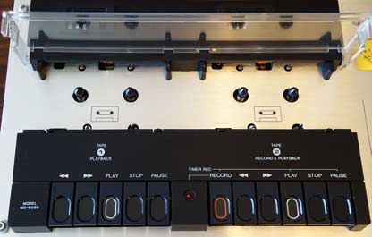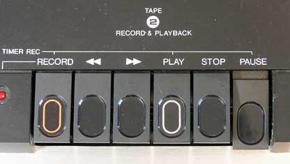 つまり、全体的には、左側に2台分のテープトランスポート部、右側には集約されたオーディオ操作部分があるという機能的なレイアウトになっている。 基本的には、当時でも既に時代遅れになりつつあった水平型のデッキなのだが、機能優先的なレイアウトのまとめ方やデザインの工夫もあって、何やら音楽スタジオ向け業務用デッキ的な雰囲気を醸し出している。 さらに、詳しく見てみる。 まず、トランスポート部分であるが、2台並んでいる左側のTAPE1は再生専用で、右側のTAPE2は録音再生ができる。 つまり、ダビングする場合は、必ずTAPE1→TAPE2ということになる。 |