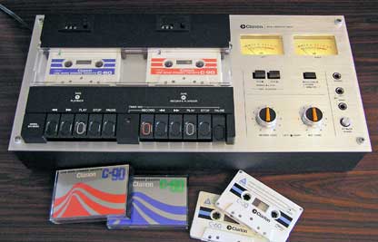 当時のカタログや広告からの抜粋である。 ・型 式: ステレオデュアルカセットデッキ ・主な機能: タイマー録再、ミキシング録音、オートストップ ・ヘッド構成: 消去×1、録再×1(硬質パーマロイ)、再生×1(硬質パーマロイ) ・モーター: 電子ガバナー型×2 ・ワウフラッタ: 0.13%(WRMS) ・周波数特性: (クロームテープ)30〜16,000Hz (ローノイズテープ)30〜12,000Hz ・歪 率: 2%以下 ・S/N比: 50dB ・録音方式: 交流バイアス・105kHz ・消去方式: 交流消去 ・消去率: 50dB以上 ・FF/REW時間: 95秒以内(C-60) ・入 力: MIC→10kΩ 0.3mV LINE IN→330kΩ 30mV REC・PB→8.2kΩ 0.75mV ・出 力: LINE OUT→10kΩ 300mV REC・PB→10kΩ 300mV PHONES→8Ω 0.3mW ・使用半導体: トランジスター×23、ダイオード×8 ・電 源: AC100V(50/60Hz) ・消費電力: 10W(電気用品取締法に基づく) ・外形寸法: 460(W)×110(H)×225(D)mm ・重 量: 5kg ・価 格: 59,800円 |