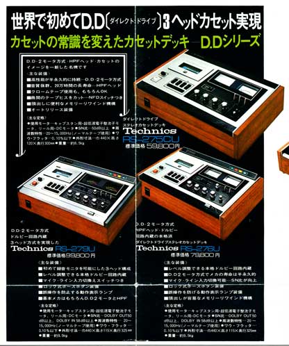 再生専用のドルビー回路を組み込むためには全体設計を見直さなくてはならず、かなりのコスト高になってしまうため、再生専用アンプのドルビーデコード機能は省略し、アフターモニターに特化した3ヘッド機として本製品を企画したのではないか・・と想像するのである。 そのため、ドルビーONでの録音中のアフターモニターは、ドルビー(Bタイプ)でエンコードされたキンキンした音をモニターすることになる(笑)。 3ヘッドのトップバッターとしてはやむを得なかったのだろうが、本製品の後に各社から発売された3ヘッドのカセットデッキは、いずれも上記メリットの(1)、(2)両方の実現を目指したものとなっているので、それらと比較してしまうと若干残念ではある。 本製品の最大の特徴である3ヘッドについての話が長くなってしまったが、その他の特徴についても述べていこう。 【ダイレクトドライブ&2モーター方式】 キャプスタンのダイレクト駆動は、初のDD機である「RS-275U」以来、Technicsデッキのお家芸とも言えるが、本製品でも採用されている。 また、早送りや巻戻し時のリール高速駆動時には専用のDCモーターを使う2モーター方式となっている。 【ホットプレスフェライトヘッド】 この時代のTechinicsのデッキは、摩耗に強い「HPF(ホットプレスフェライト)」ヘッドを採用していることが謳い文句であった。 当然ながら、本製品の録再兼用ヘッドは「HPF」なのだが、実は、細い再生専用ヘッドも「HPF」でつくられたナローギャップのヘッドが使われている。 【ソフトタッチボタンによるオペレーション】 これもこの時代のTechinicsの高級タイプのデッキ共通で、テープの走行は軽いストロークのソフトタッチボタンにより操作する方式になっている。 当時のほとんどのカセットデッキは、メカニカルなピアノキー式のボタンで操作する方式であり、これとは一線を画す高級な仕様となっている。 【レベル調整機能付きドルビーNR】 ドルビーNR(Bタイプ)は、本製品が発売された頃の高級タイプのカセットデッキにおいて採用が進んでおり、本製品でも採用されている。 さらに、ドルビー録音されたテープを正しく再生できるように、本製品にはドルビーレベル調整機能が付いている。 【上面操作の水平型デッキ】 これについては、特徴というより1970年代前半のカセットデッキの標準形というべきであるが、本製品もオール上面操作のいわゆる「水平型」のデッキである。 ちなみに、正面操作のいわゆる「コンポタイプ」のデッキが登場するのは70年代の中頃である。 |