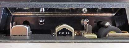 このような条件の下で、3つ目のヘッドをテープにタッチさせるにはどうしたらよいのか? 本製品ではその解決策として、録再ヘッド用とピンチローラー用の開口部の間にある小窓を使っている。 この小窓は特定の用途のためではなく、予備的なエクストラホールだったようで、カセットテレコ初期には、オートストップ用のセンサー棒を差し込むために使われていたりもした。 そもそもヘッドを入れることなど想定していない小さな穴にヘッドを突っ込む(笑)、ということで、本製品の3つ目のヘッドである再生専用ヘッドは、その苦労の跡がうかがえるような独特の形をしている。 |