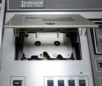 まず電源を入れる。 電源スイッチはパネル面手前、一段低くなっている部分の右にある銀色の四角いボタンである。 電源を入れるとメーターの照明が点灯する。 パネル面の最も左にある黒い「EJECT」ボタンを押すとカセットリッドが勢いよく開く。 リッドとともに内部のカセットベース(受け台)の手前部分も持ち上がる。 カセットテープをベースに載せて下に押すと、カセットはリッド内に固定(ローディング)される。 |