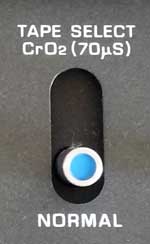 テープがローディングされたところで、録音の操作に入ろう。 まず、テープセレクタースイッチを使用テープの種別に合わせる。 スイッチは「NORMAL」(=TypeT)と「CrO2」(=TypeU)のいずれかを選ぶだけのものである。 |