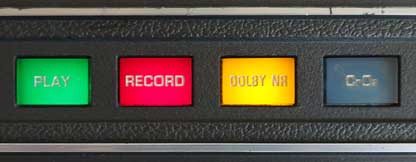 この「RECORD」ボタンはソフトタッチで、ストロークはやや大きいが力はほとんど要らない。軽く押すだけで、バシッと反応してくれるのは大変に小気味よい。 この状態で録音レベル調整が可能となるのだが、ドルビーNRを使って録音する場合はその準備が必要となるので紹介しよう。 まず、「DOLBY NR」スイッチを「IN」にする。(黄色い「DOLBY」のインジケーターが点灯する。) |