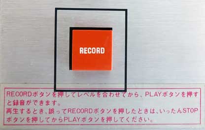 続いて、録音のためのレベル調整を行う。 パネル面の左手前側にある「RECORD」と表示された赤い録音ボタンを押す。 デッキ内部にあるソレノイドが動作して録音スタンバイ状態になり、「RECORD」の赤いインジケーターが点灯する。 |