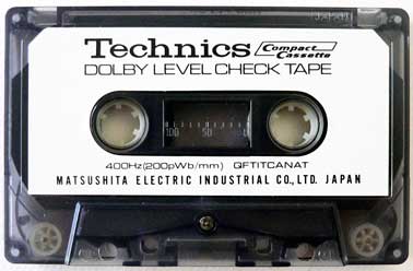 録音するテープの冒頭部分に400Hzの単信号(正弦波のことか?)を数秒間録音する。 この時、レベルメーターが「CAL」を指すよう、録音レベル調整ツマミで調整する。 と、取扱説明書には記載されているのだが、実は本製品に400Hzの発信器は内蔵されていない(笑)。 では、どうするのかというと、取扱説明書の記載を転記すると、 「 400Hzの信号源を得るには次の方法があります。 a. 発信器を用いる。 b. 付属のレベル調整用テープを他のカセットテープレコーダーにかけ、それを録音する。 c. マイクロホンを用い、「アー」「イー」などの発声や笛などを鳴らして録音する。 」 ・・・・・。 「a.」は極めて常識的方法だが、残念ながらTechnicsやナショナルから本製品用の発信器は発売されておらず、一般的なユーザーとしては「発信器」とやらをどうやって入手したらよいのか困惑するばかりだろう。 「b.」の「付属のレベル調整用テープ」とは下の写真のものである。この方法では、別途カセットテレコかデッキが必要となるが、最も現実的な方法かもしれない。 「c.」は「冗談か??」と思わせるような記述だが、実際に取説に記載されているのである。 |