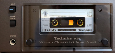 これで曲間のタイミングを計っているとずっこけそうになる(笑)。 あくまで目安用ではあるのだが、なぜに中途半端なのだろうか?? 謎である。 イジェクトボタンを押すと、カセットリッドがパネル面と平行に静かにせり出し、最後にガクッと手前に傾く。「M88」などのテクニクスデッキ共通の仕様だが、カセットを上から斜めに、自然な感じでスロットインできるので、これは大変使い勝手が良い。 カセットを入れ、リッドを押し込む。 続いて録音の準備に入る。 使用テープの種類に合わせて「tape select」のプッシュボタンを押す。 本製品はTypeTからWまで、全てのタイプが使える。Metal(メタル=TypeW)とFe-Cr(フェリクロム=TypeV)の両方が使えるというのはこの時代のデッキならではである。 |