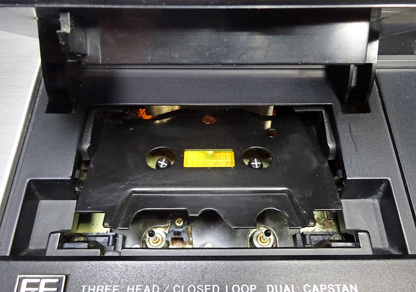 カセットを押し込むと、左右から爪が出てきてカセットが固定される。 リッドは閉めてもよいし、開け放しのままでもテープの動作には影響はない。 |