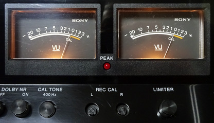 テープセレクターを合わせたら、録音キャリブレーションを行う。 これは、先述のように、ドルビー録音されたテープが適正にデコードされるよう「録音レベル=再生レベル」となるように、テープの録音感度に合わせて入力レベルを補正するものである。 ドルビー録音をしない場合は特に調整する必要は無いのだが、調整しておいた方が録音時のレベル監視がより適切にできるし、モニタースイッチを切り換えた際に音量が変わるのは気分的によろしくない(笑)ということもあるので、やっておいた方が良い。 調整の方法はさほど難しくない。 左ch.のメーターの下にある「CAL TONE」のボタンを押し込む。 「MONITOR」スイッチを「TAPE」側に倒す。 操作ボタンの「RECCORD」を押したまま「▶」(送り)を押し、録音をスタートさせる。 400Hzの信号が録音されるので、「CAL TONE」スイッチの右にある「REC CAL」のネジをマイナスドライバなどを使って回し、レベルメーターの針が左右とも「CAL」の位置を示すようにする。 調整が終わったら、「DOLBY NR」スイッチの「ON」又は「OFF」のボタンを押すと「CAL TONE」ボタンがリリースされる。 |