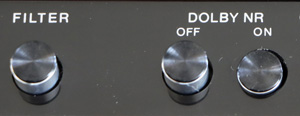 このように、キャリブレーションが簡単にできるのも、録音同時再生ができる3ヘッドの利点である。 ドルビーを使って録音する場合は、「DOLBY NR」の「ON」のボタンを押し込む。すると、パネル奥の左側に並んでいるインジケーターのうち、左から2番目の「DOLBY」の黄色いランプが点灯する。 ドルビーを使ってFMのステレオ放送を録音する場合は、ステレオ復調用のパイロット信号によりドルビー回路が誤動作することを避けるため、「FILTER」スイッチを押しておく。 |