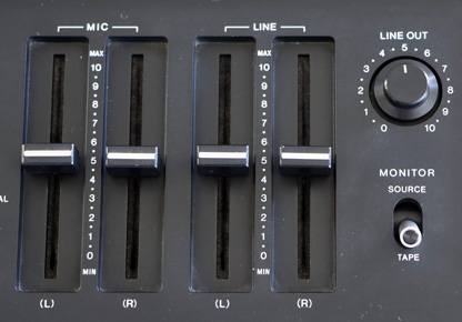 続いて、録音レベルの調整を行う。 パネル面の右手にある「MONITOR」スイッチのレバーを「SOURCE」側にする。 先述のように、本製品はライン入力とマイクのミキシングが可能で、それぞれの入力ボリュームも独立しており、個別にレベル調整することが可能である。 ボリュームはスライド式である。水平型デッキのスライドボリュームというのは大変使いやすい。何より、スタジオのコンソールのようでカッコイイ。 |
